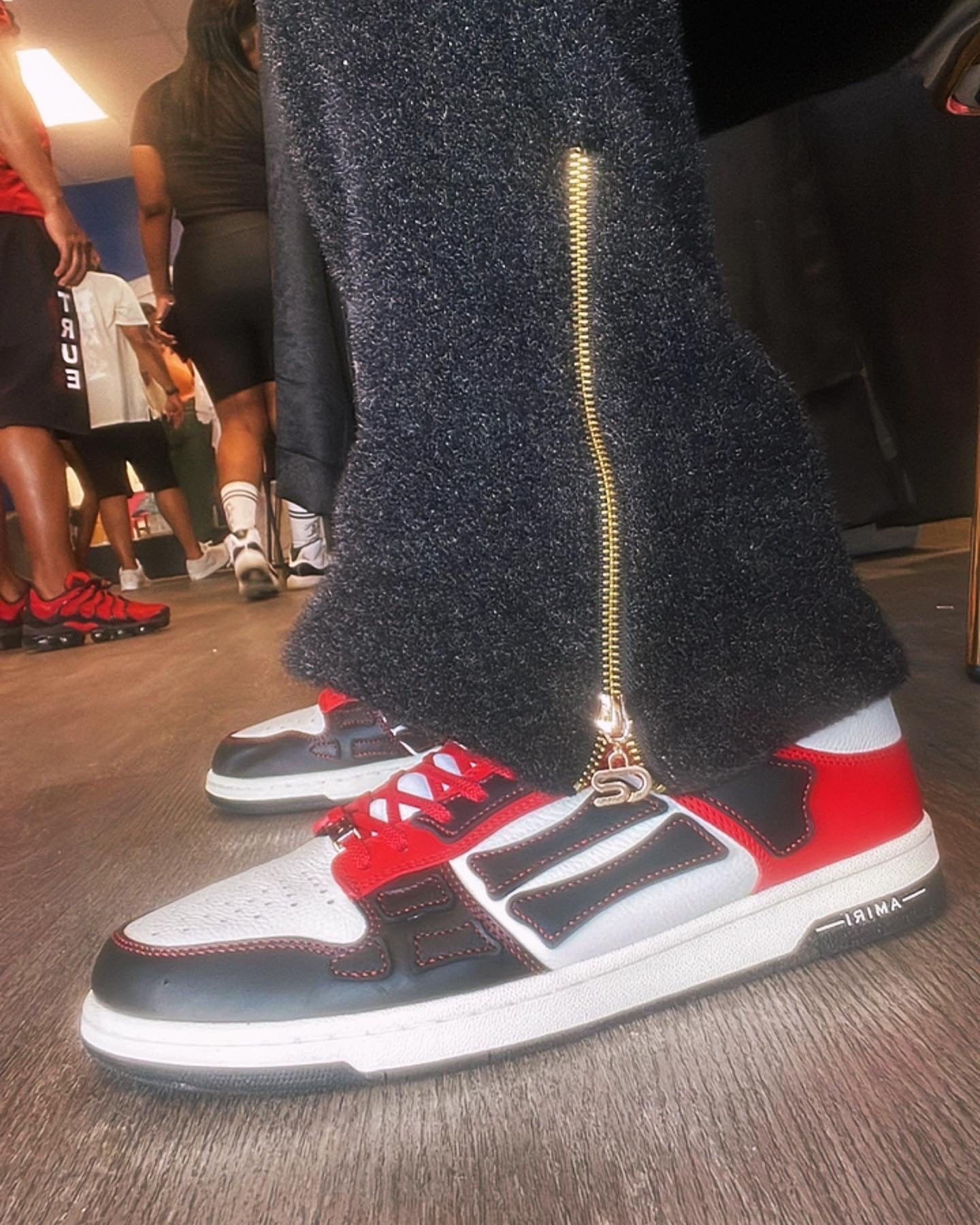 StreetDream in white text going down left leg with custom gold logo zippers on bottom